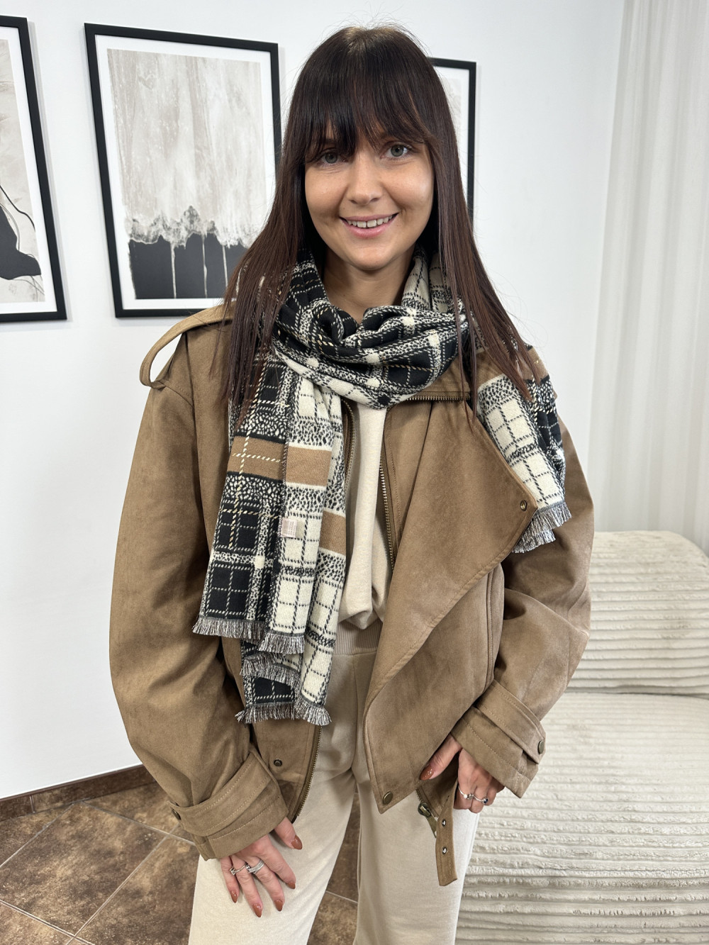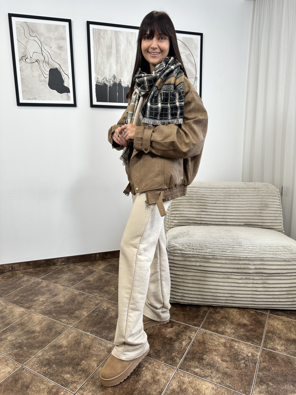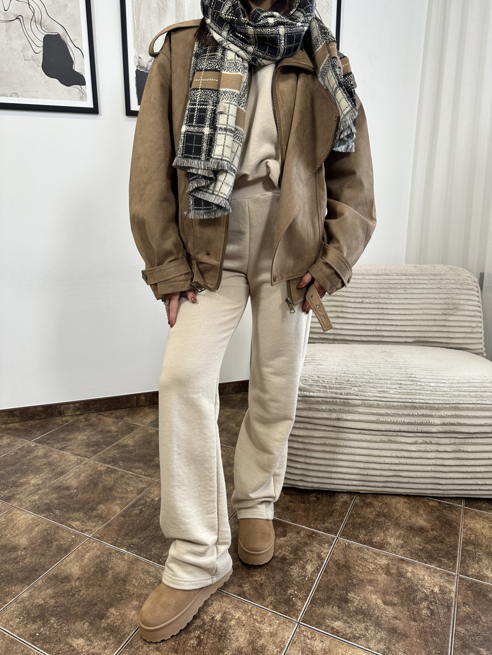 Beżowy komplet bluzka i spodnie to kwintesencja codziennej wygody w stylowym wydaniu. Jeśli szukasz zestawu, który sprawdzi się w każdej sytuacji to idealny wybór. Bluzka z dekoltem w serek w połączeniu ze spodniami z szerszą nogawką tworzy harmonijną całość, która wygląda niezwykle nowocześnie i swobodnie. Wysoki stan spodni podkreśla talię, a luźniejszy fason zapewnia pełen komfort ruchów.