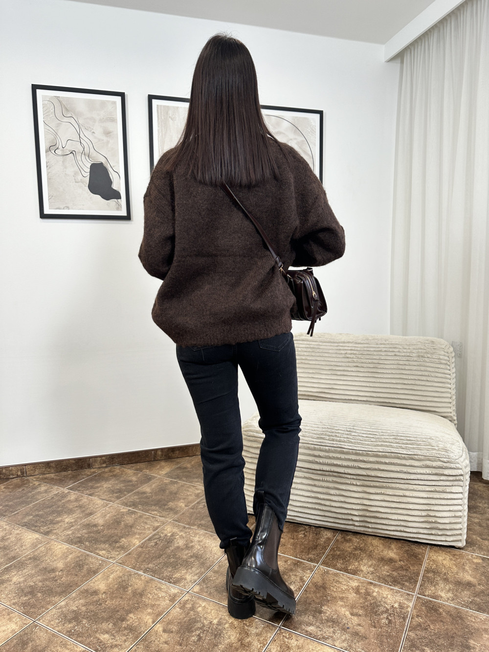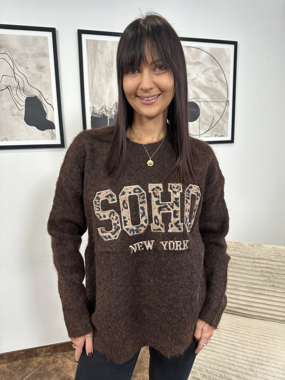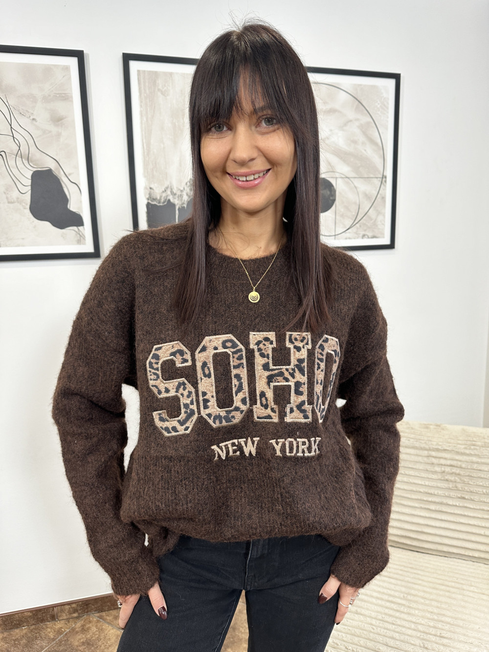 Sweter wyróżnia się ozdobną aplikacją. Posiada okrągły dekolt, zarówno przy rękawach, na dole i na górze znajdują się ściągacze.