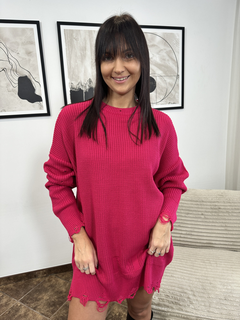 Sukienka o sweterkowym splocie, wyprodukowana w Polsce. Model wyróżnia się efektownym, poszarpanym wykończeniem dołu oraz rękawów. Klasyczny okrągły dekolt. Występuje w dwóch kolorach.